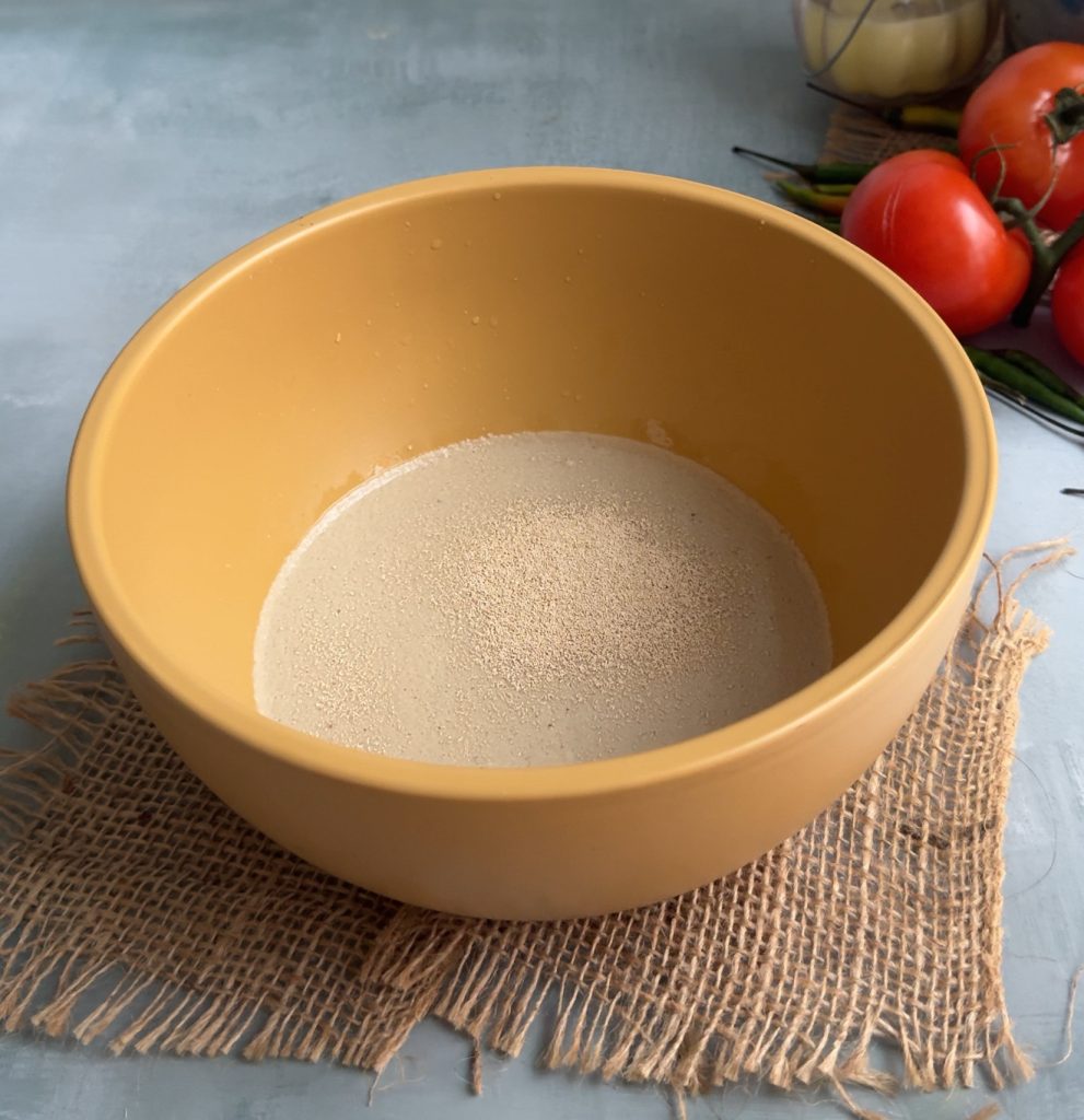 - In a large bowl, combine ½ cup warm water, sugar, and instant yeast. Mix well, cover, and let it rest for 5–10 minutes until bubbly. If it does not foam, repeat with fresh yeast.