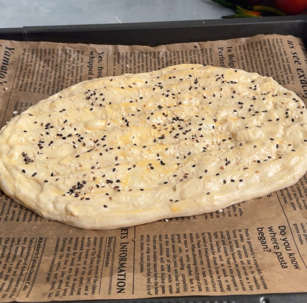- Sprinkle nigella seeds and sesame seeds generously on top for flavour and authentic bakery style appearance.