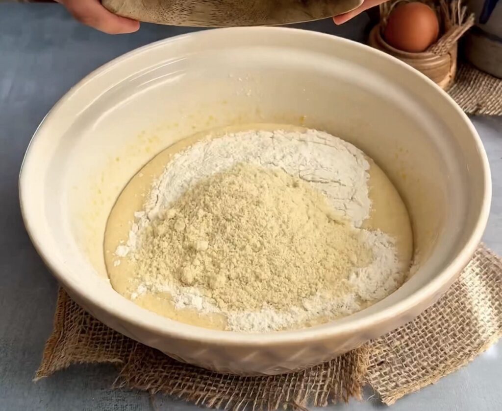 - Whisk Eggs and Sugar Until Truly Airy – Do not rush this step. Whisking for a full 3–4 minutes incorporates air, which helps create a light, fluffy almond cake without relying only on baking powder. The mixture should look pale, thick, and slightly ribbon-like before moving forward.