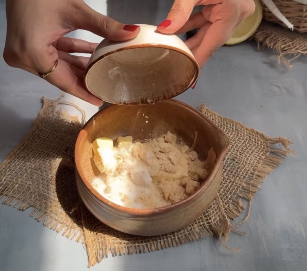 First, combine cold butter, flour, white sugar, and brown sugar in a small bowl. Use your fingertips or a fork to mix until a crumbly texture forms. For best results, place the crumble in the refrigerator while you prepare the muffin batter so it stays firm and creates defined clusters during baking.