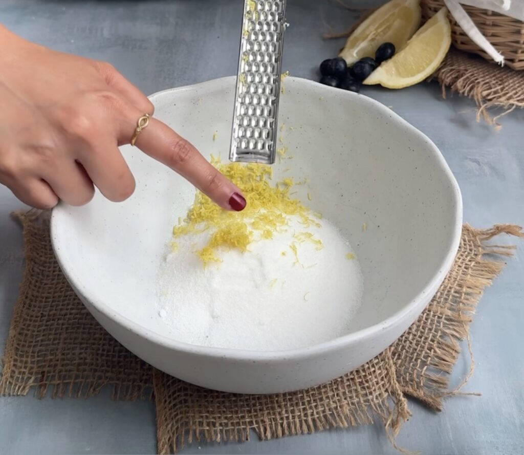 - Rub lemon zest into the sugar until fragrant and slightly pale.