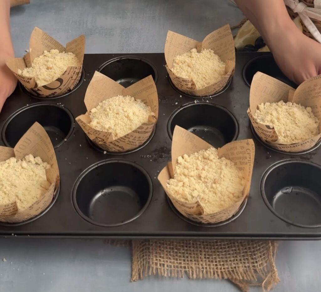 - Divide the batter evenly into muffin cups. Let rest for 5 minutes, then top generously with chilled crumble.