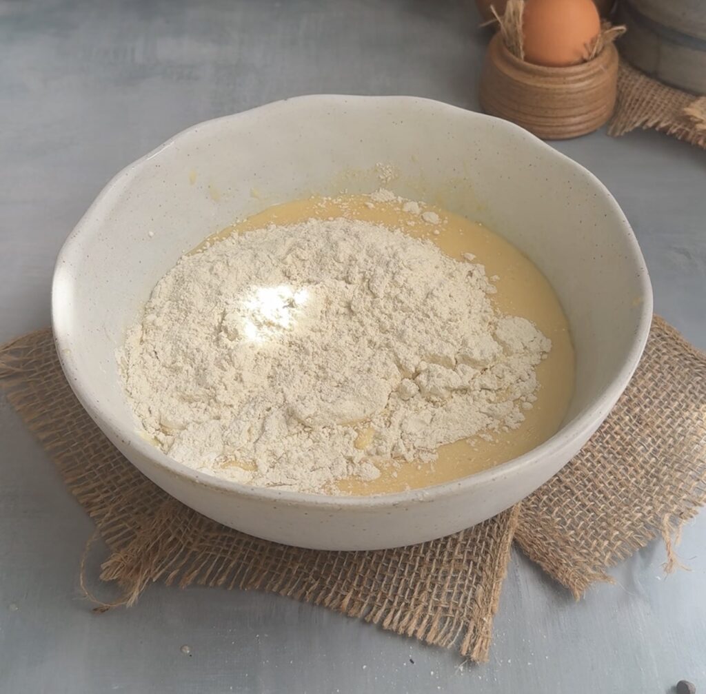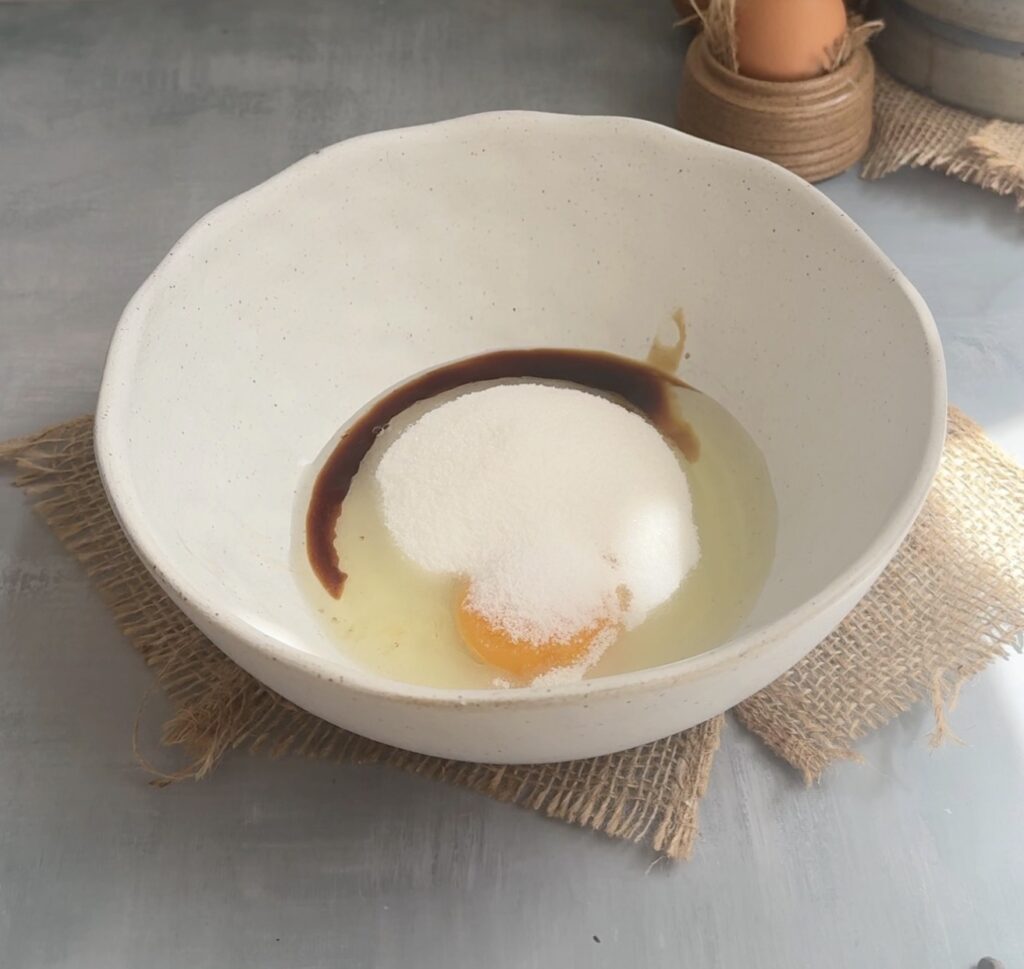- In another bowl, beat the egg and sugar until the mixture becomes light in colour and slightly fluffy.
