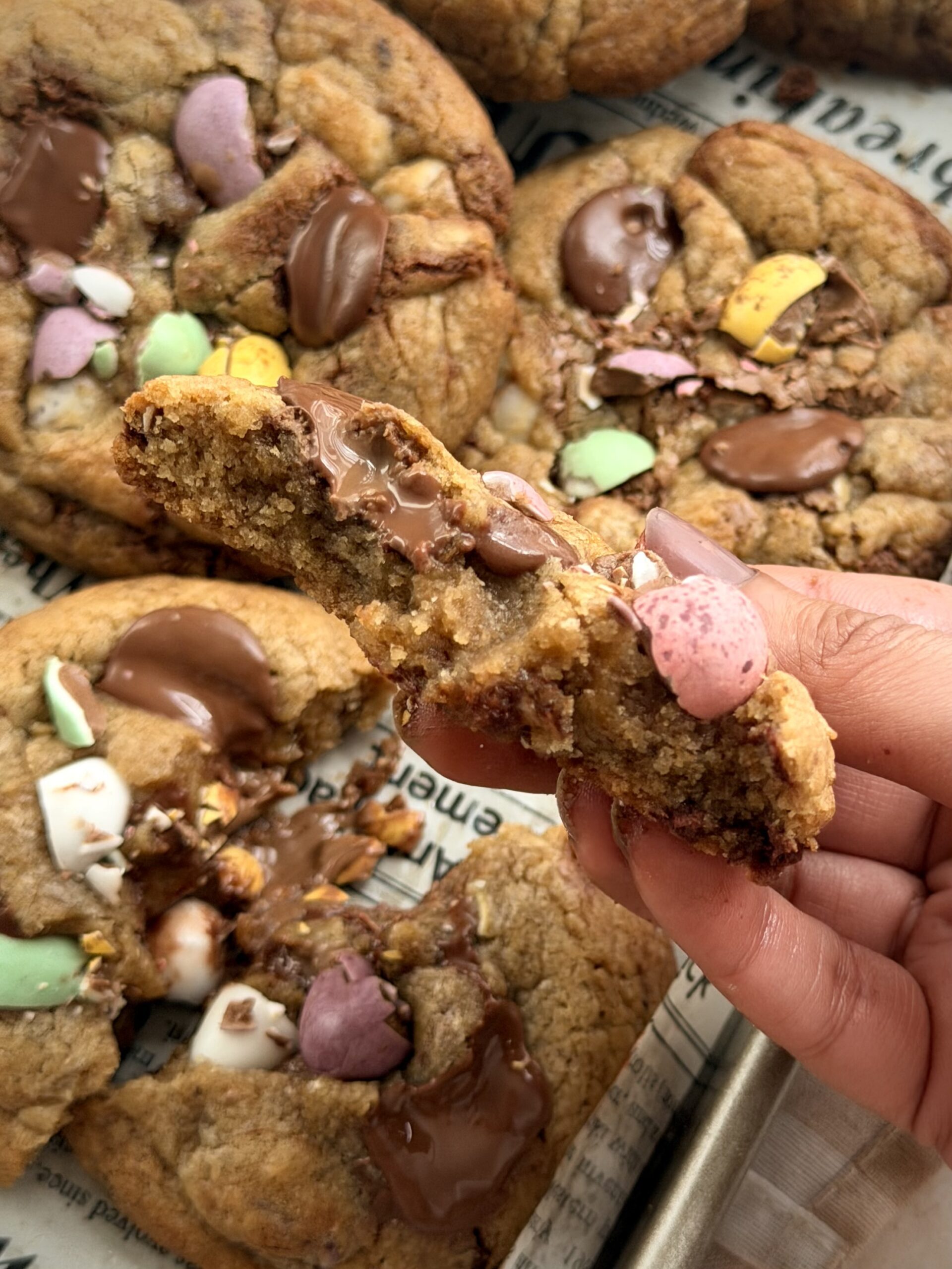Mini Egg Chocolate Chip Cookies that are thick, and soft with crisp edges and gooey centers. Packed with melty and crunchy Mini Eggs, this easy cookie recipe uses a chilled dough method to create perfectly chewy cookieswith a professional finish every time.