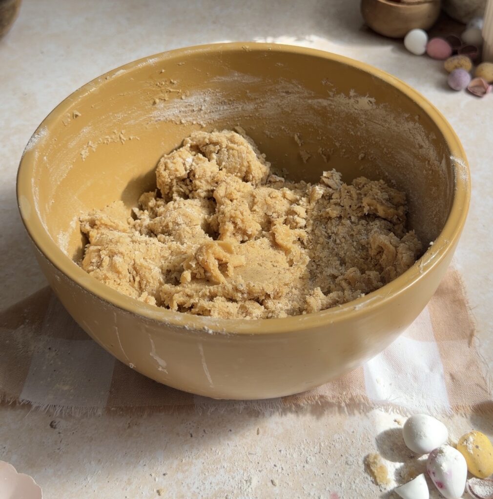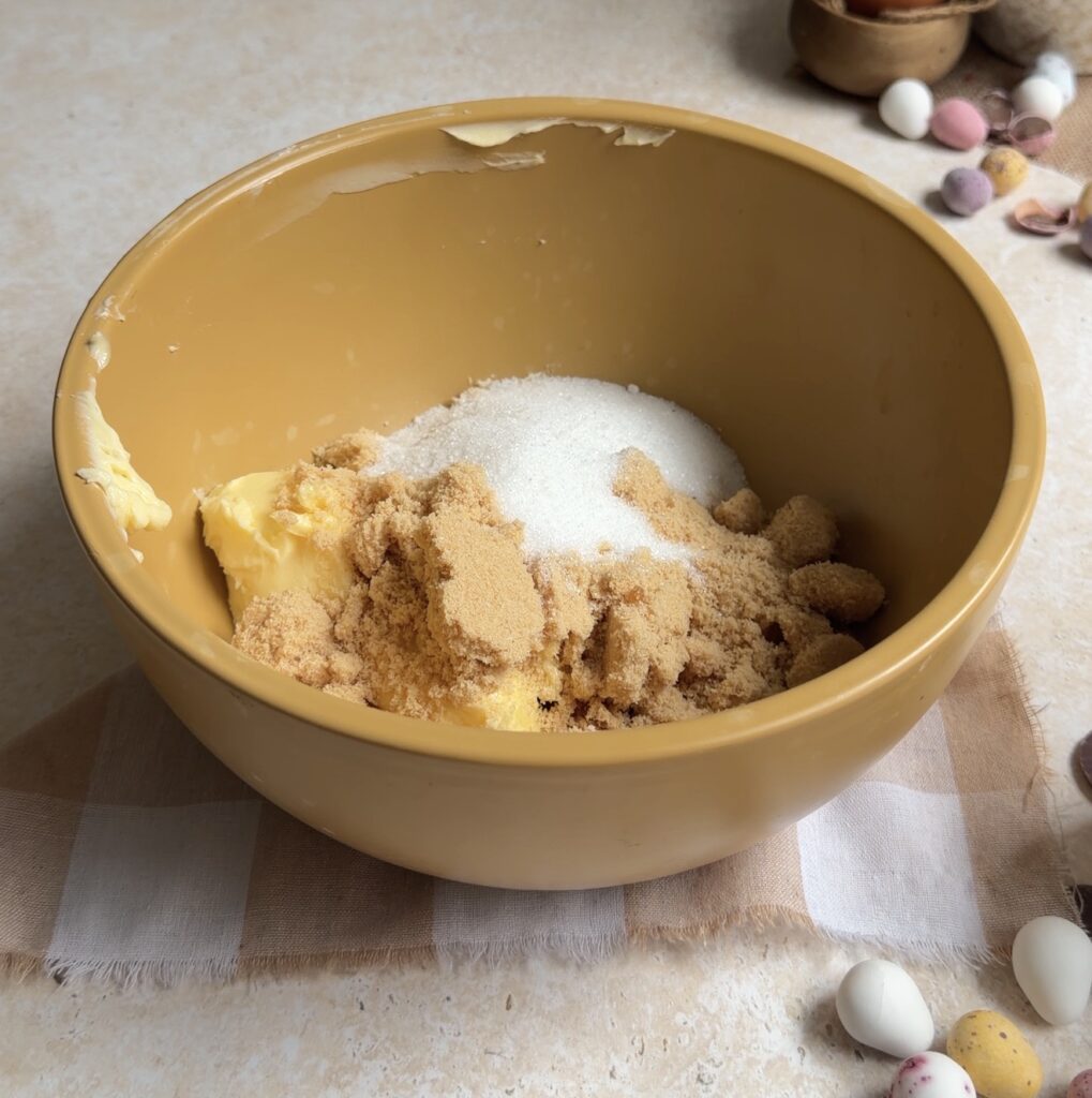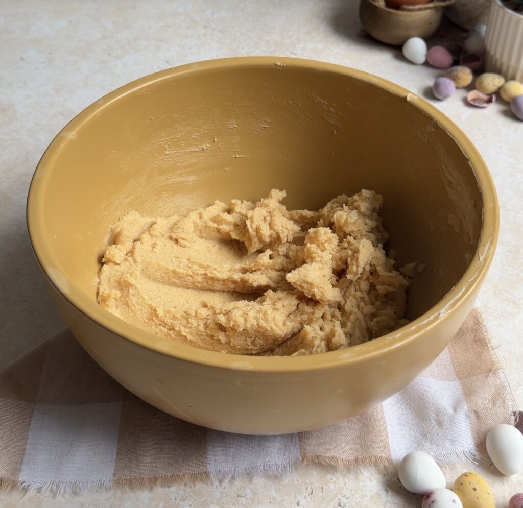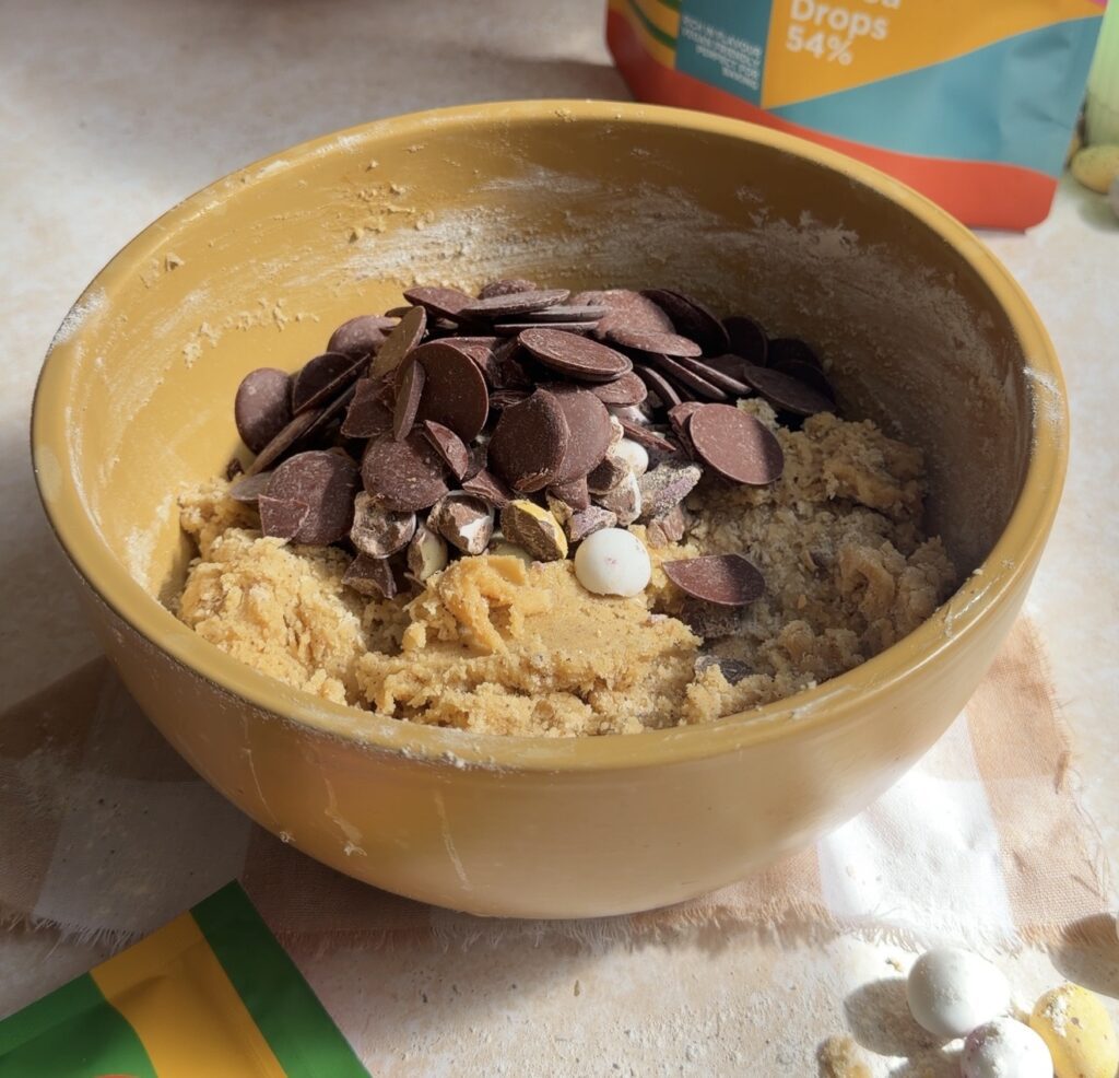 After that, add the chocolate chips and crushed Mini Eggs, folding gently to evenly distribute the mix-ins throughout the cookie dough.