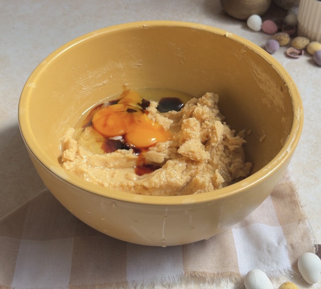 Next, add the egg, extra yolk, and vanilla extract, and mix until just combined. Avoid overmixing at this stage to maintain a tender cookie texture.