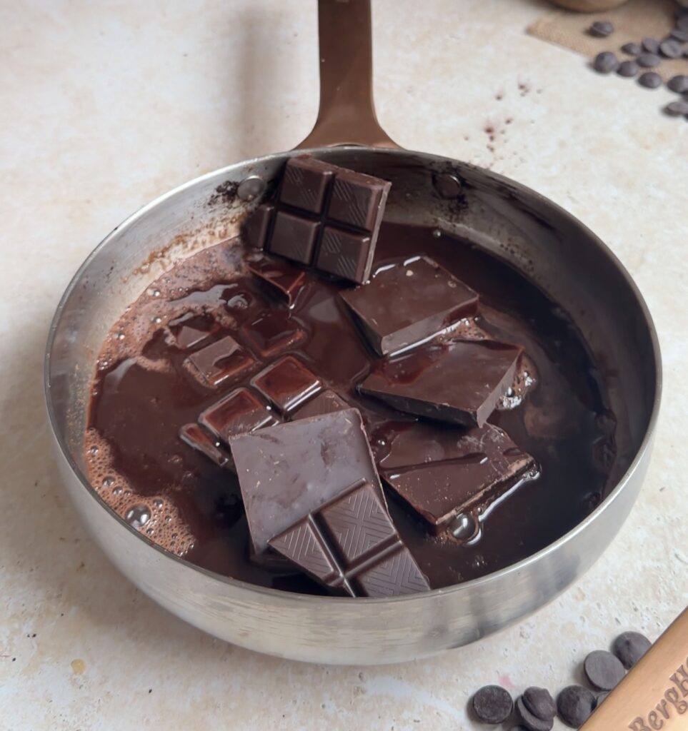 - In a pan, cook butter over medium heat until golden and nutty. Turn off the heat, then mix in oil and cocoa powder until smooth. Add dark chocolate and stir until melted. Let it cool slightly.