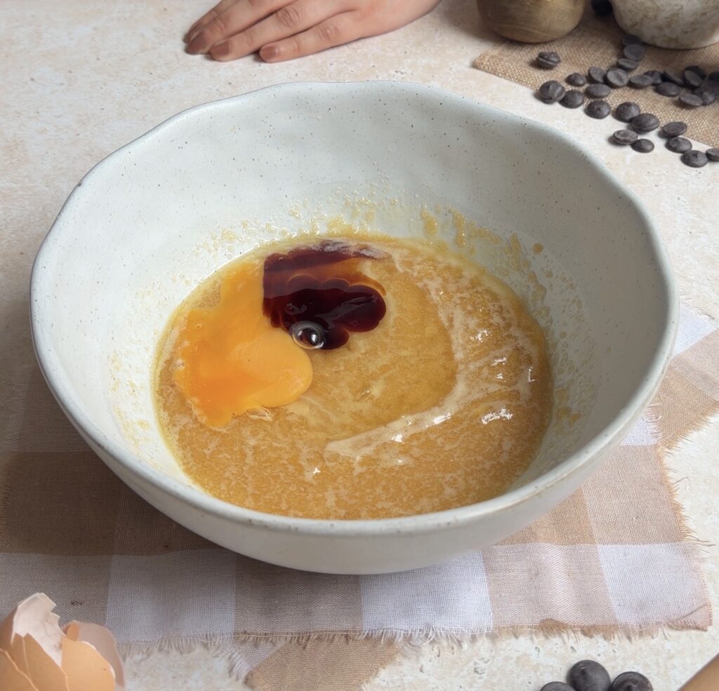 In a separate bowl, beat the eggs, brown sugar, caster sugar, and vanilla extract together until the mixture becomes light, pale, and slightly thickened. To achieve this, beat for at least 3–4 minutes using an electric mixer or about 5 minutes by hand whisk until the mixture turns light and fluffy. This step helps create a better texture in the final brownie layer.