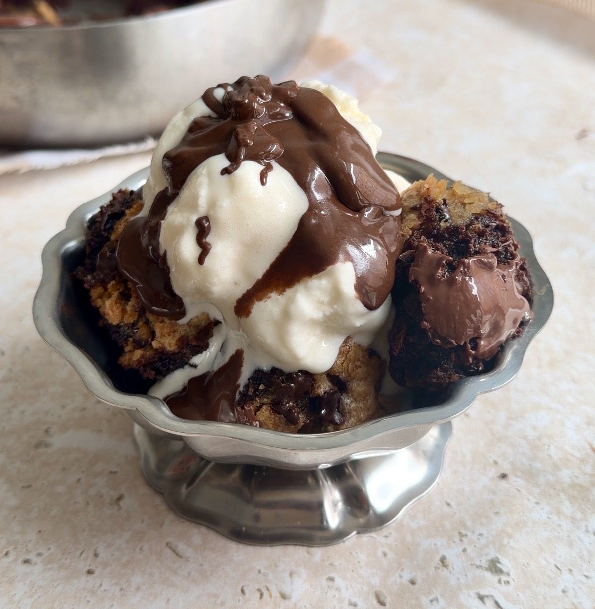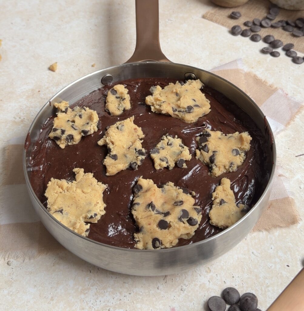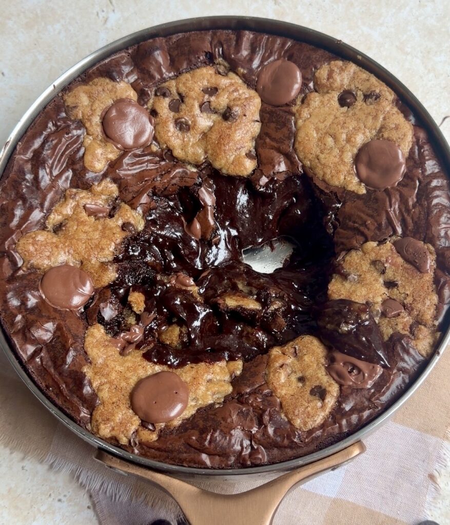- Monitor Baking Time Carefully – Keep an eye on the brookie while it bakes. If the top begins to brown too quickly, loosely cover the skillet with foil after about 20 minutes to protect the cookie layer while the centre continues to bake through evenly.