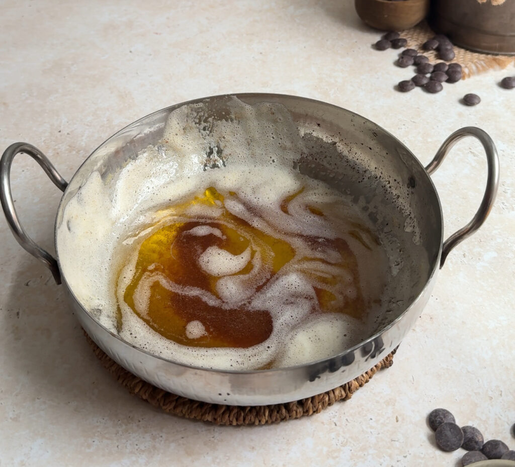 Next, place the butter in a saucepan over medium heat and cook until it turns golden brown and develops a deep nutty aroma. Stir occasionally and watch carefully, as brown butter can burn quickly. This step is essential because brown butter instantly elevates this viral brownie pudding, adding rich caramel-like depth.