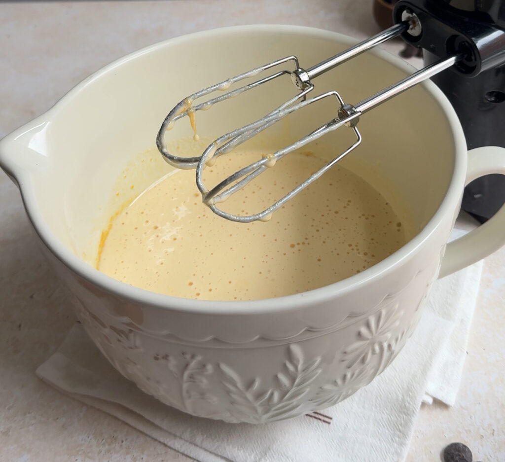 • Whisk Eggs and Sugar Well – Whisk until the mixture becomes pale and slightly thick. This step builds structure while keeping the centre soft and pudding-like instead of dense.