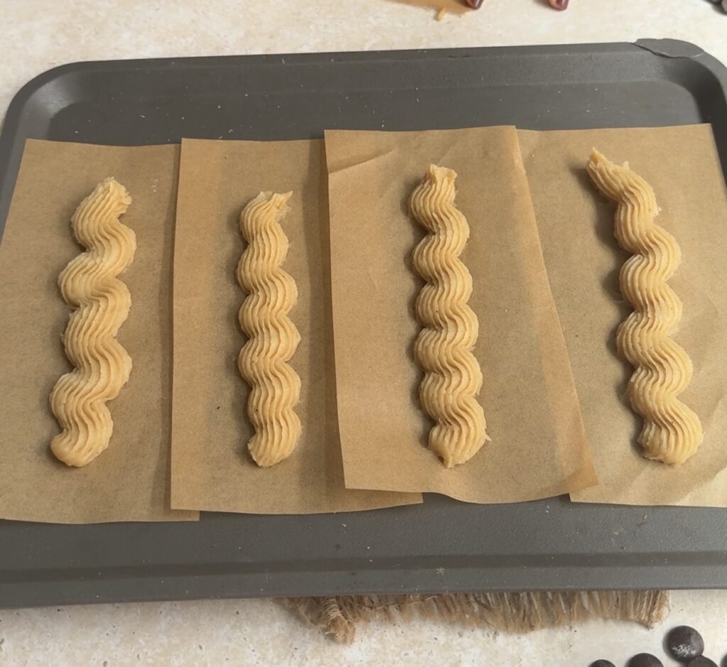 6. Fill a piping bag fitted with a large star tip and pipe 4–6 inch strips onto parchment or carefully directly into the hot oil.