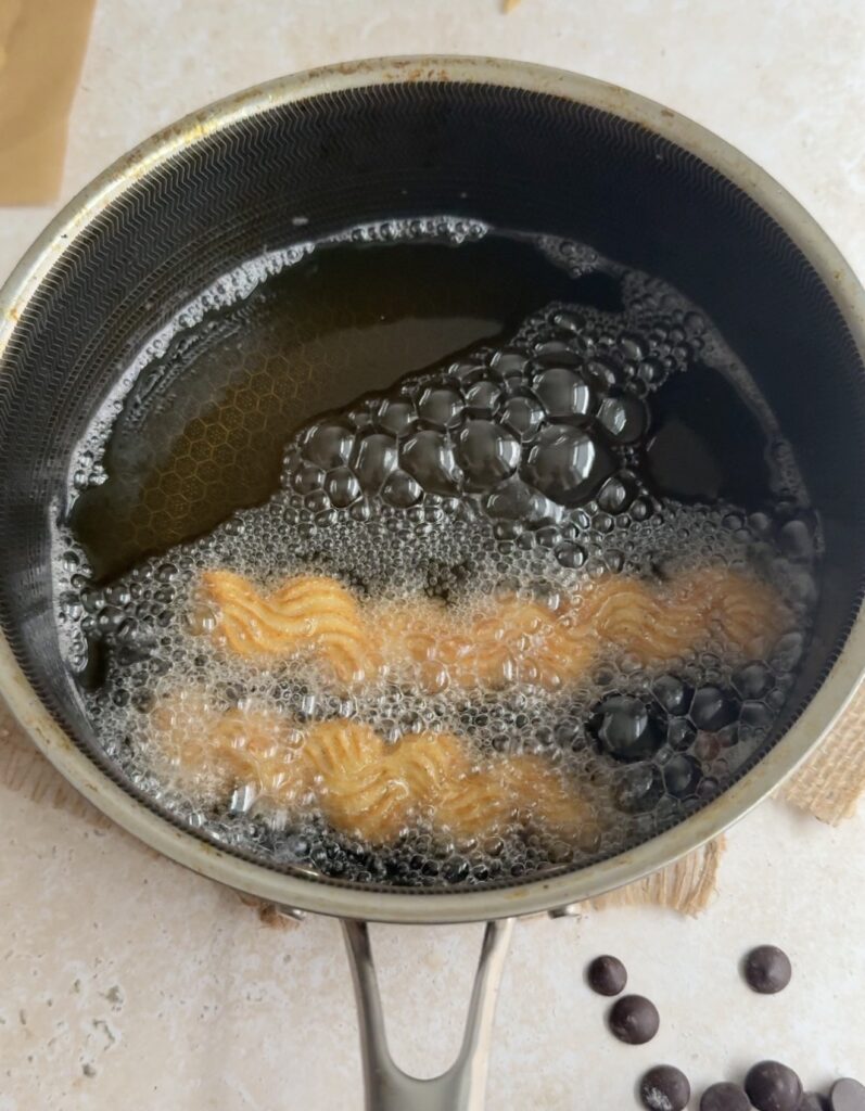 7. Fry the churros in batches, turning occasionally, until evenly golden brown and crisp on the outside.