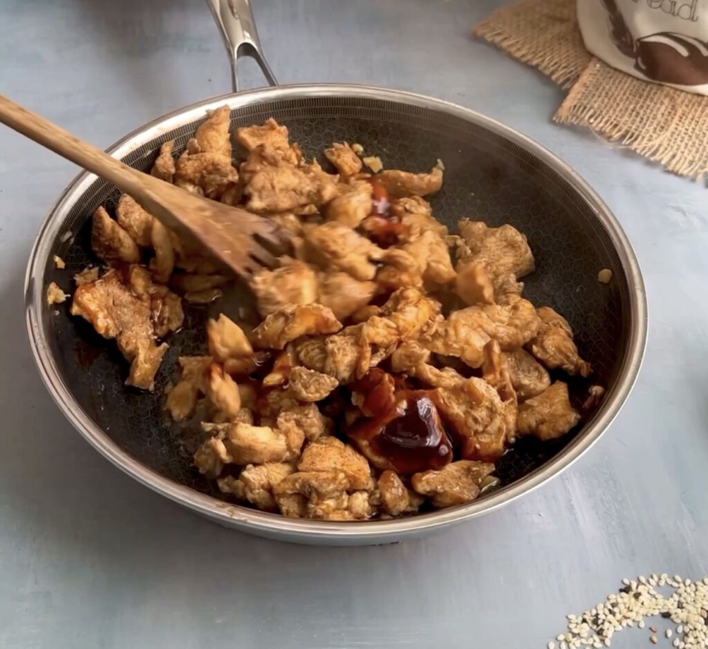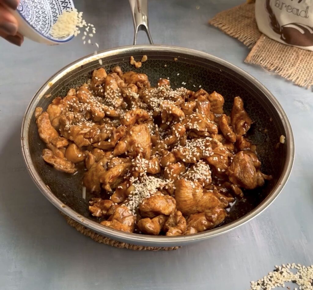 Once the chicken is cooked through, add 3–4 tablespoons of teriyaki sauce. Stir well and let it simmer for a few minutes until the sauce becomes glossy and slightly sticky. Sprinkle sesame seeds on top and turn off the heat. The result should be tender, saucy, and packed with that perfect sweet-savoury umami flavour.