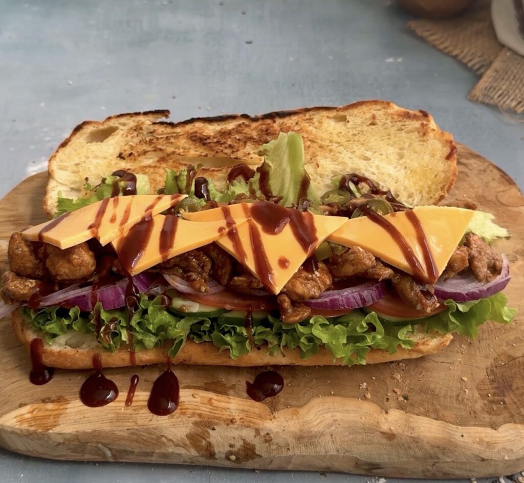 - Slice and lightly toast the sandwich rolls. Spread mayo, then add salad leaves, cucumber, tomatoes, onions, the teriyaki chicken, pickled jalapeños, cheese slices, and a drizzle of BBQ sauce before serving.