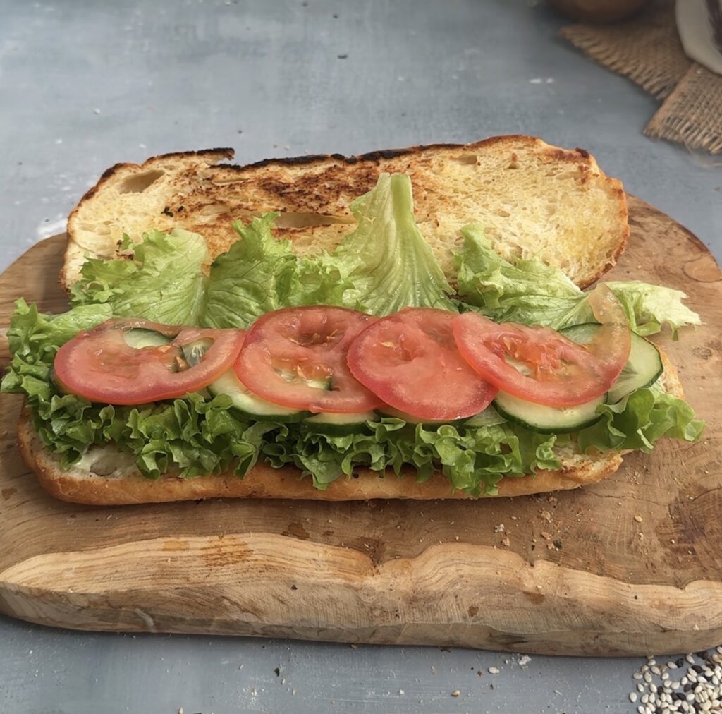 Spread mayo or garlic sauce on both sides, then add lettuce, cucumbers, tomatoes, and onions evenly across the bread.
