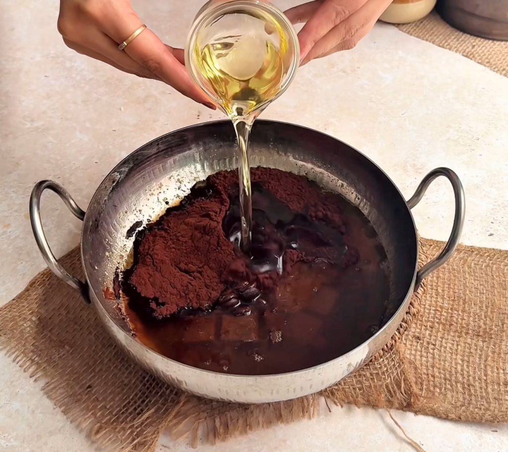- Add chocolate, oil, and cocoa powder to the hot butter. Whisk until smooth. If needed, microwave for 10–15 seconds and stir again.
