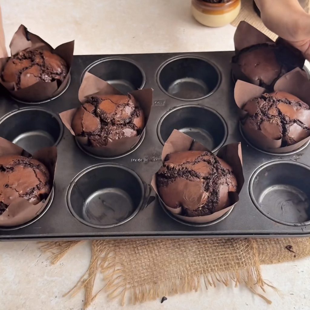 Let the muffins cool slightly, then serve warm for gooey centres and that perfect bakery-style texture. The tops will be shiny and crackly, the centres soft, and the chocolate-rich flavour irresistible.