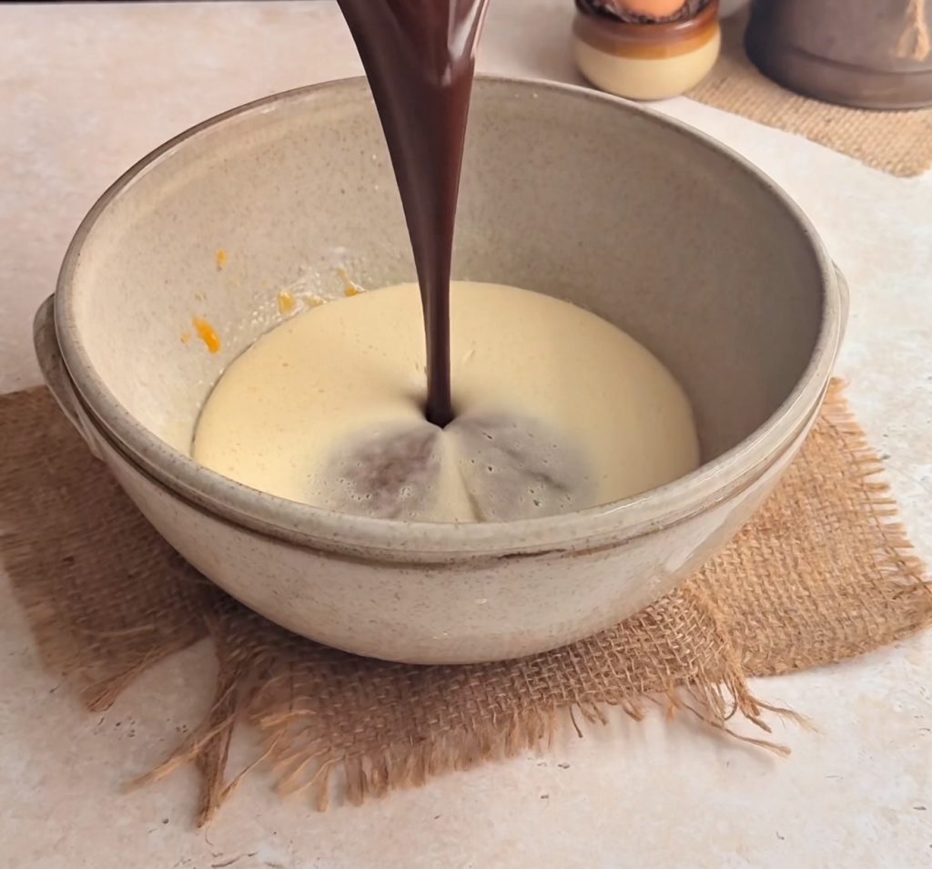 Pour the warm chocolate mixture into the whipped eggs and gently fold until fully combined. Folding gently ensures the batter stays thick and dense without losing air.