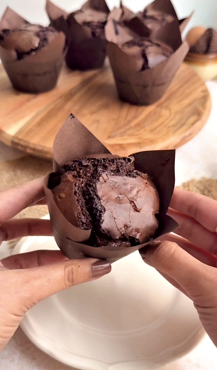 Let the muffins cool slightly, then serve warm for gooey centres and that perfect bakery-style texture. The tops will be shiny and crackly, the centres soft, and the chocolate-rich flavour irresistible.