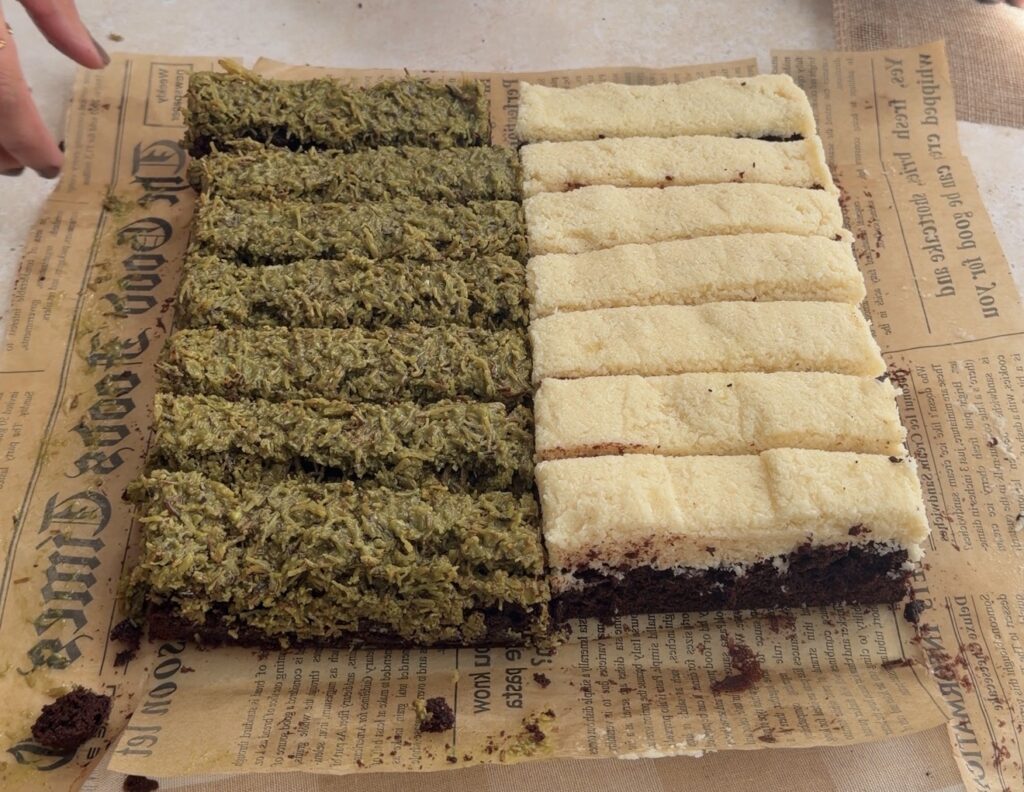 Once the brownie is still slightly warm, divide it into two halves for both flavours. I suggest that you fold your parchment paper or foil many times to make a ruler kind of thing and put in centre so you have clear boundary. Spread the coconut filling evenly over one half and the Kataifi pistachio mixture over the other. Gently press the layers so they stick well. Then refrigerate briefly to help set the layers.
