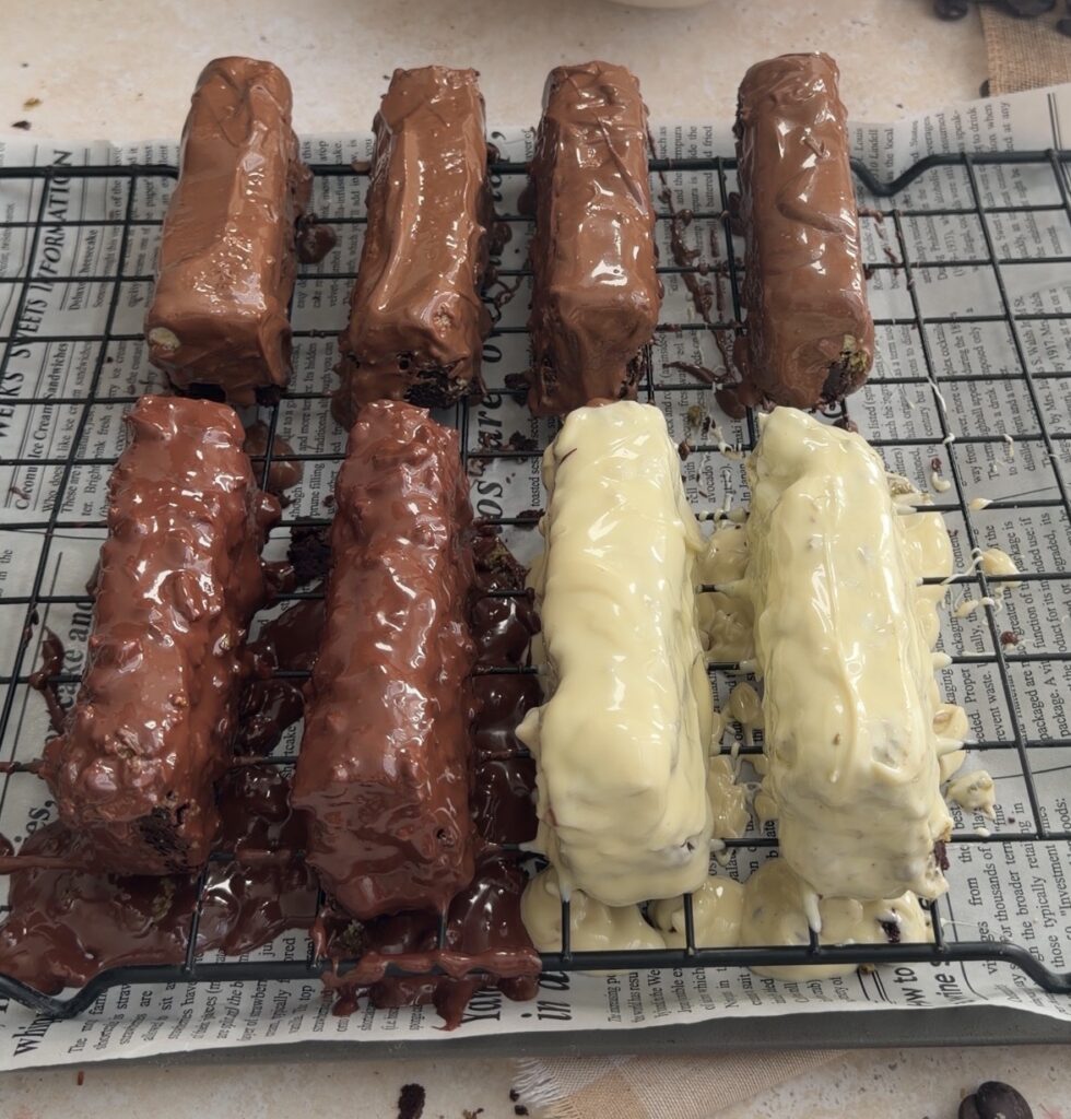 Now, cut the brownie into bars, keeping them slightly smaller for easier handling. What i recommend is that you divide each side into 8 bars. and from those 8 bars either divide them into two or just keep the length of the bar as you like and just cut tiny squares from the end. This way you will have small chocolate sized bars and little squares too or keep them big if you like!. Place them on a lined tray, and using a spoon, carefully drizzle or spread the melted chocolate over each bar for an even coating.