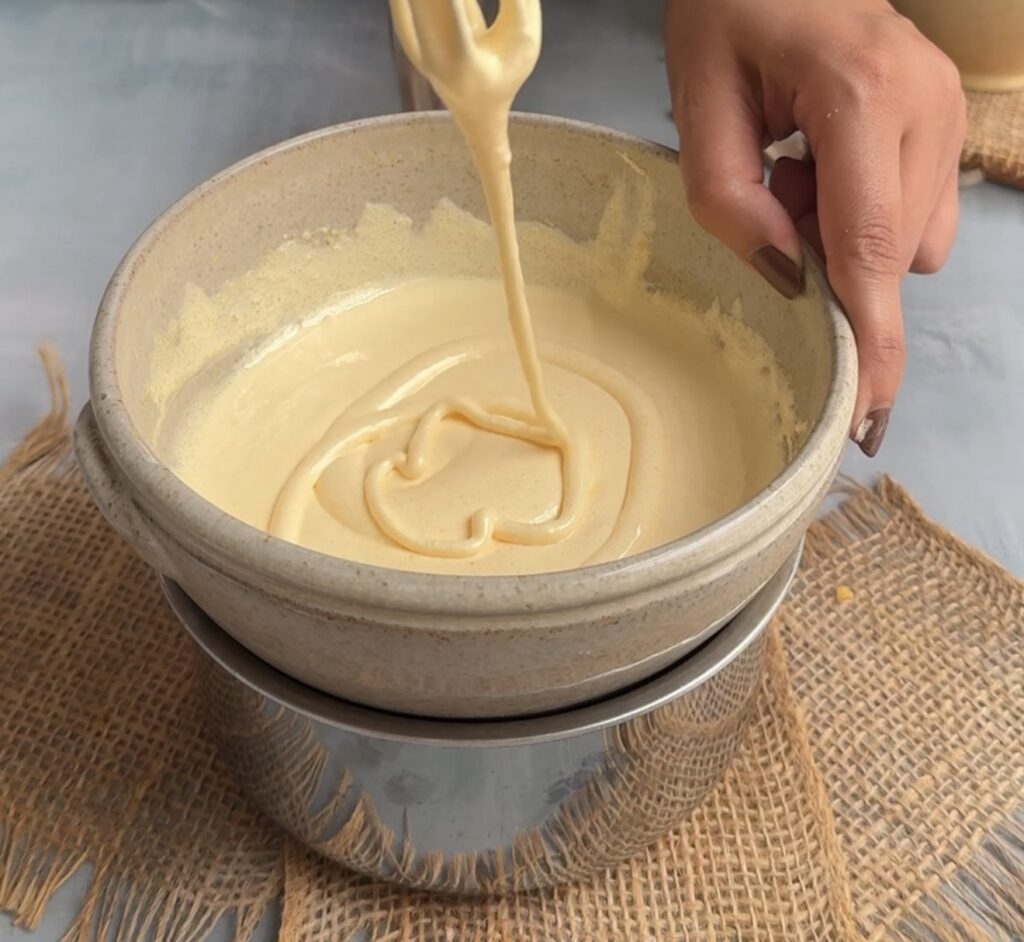 Remove the bowl from heat and whisk briefly to cool slightly. Then add mascarpone and mix until smooth and creamy. The mixture should be silky and lump-free.