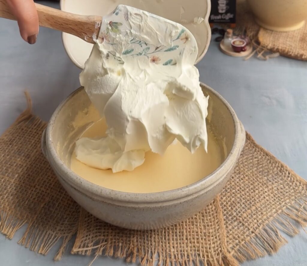 - Gently fold the mascarpone mixture into the whipped cream until combined. Do not overmix.