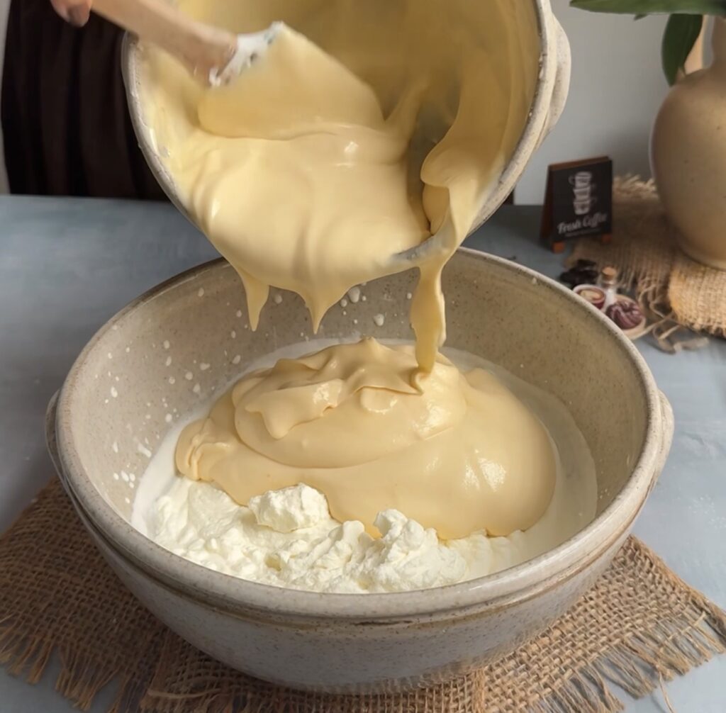 Gently fold the mascarpone mixture into the whipped cream until fully combined. Avoid overmixing to keep the tiramisu airy and smooth.