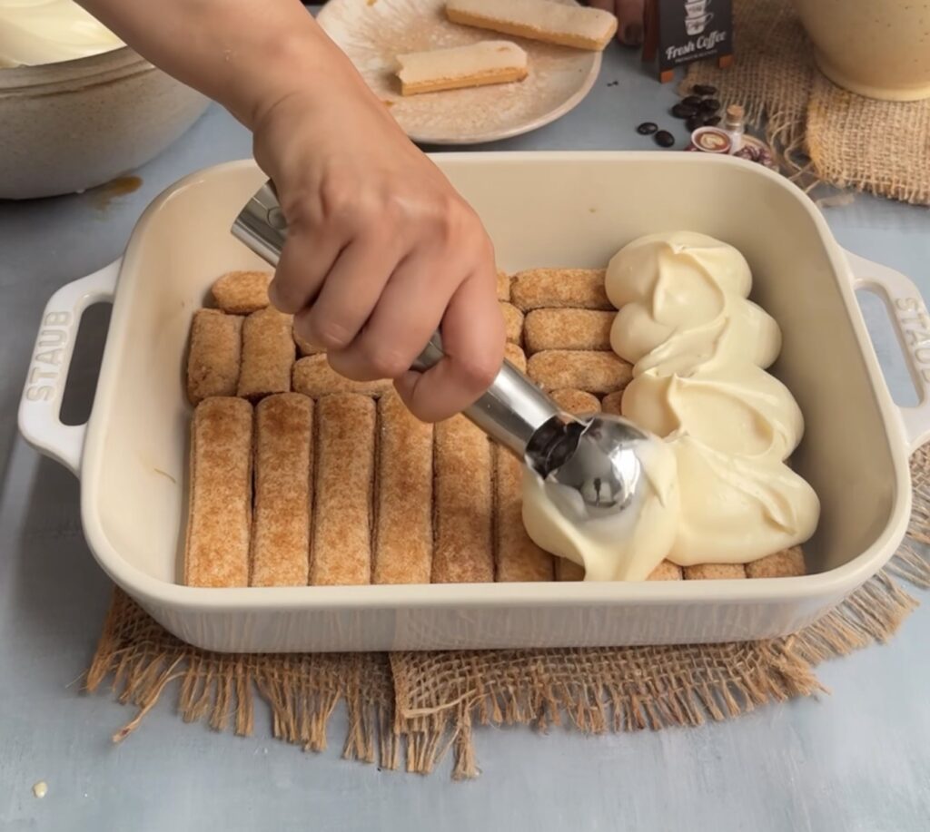 Arrange a single layer of dipped ladyfingers at the bottom of your dish. Spread half of the mascarpone cream evenly over the top.