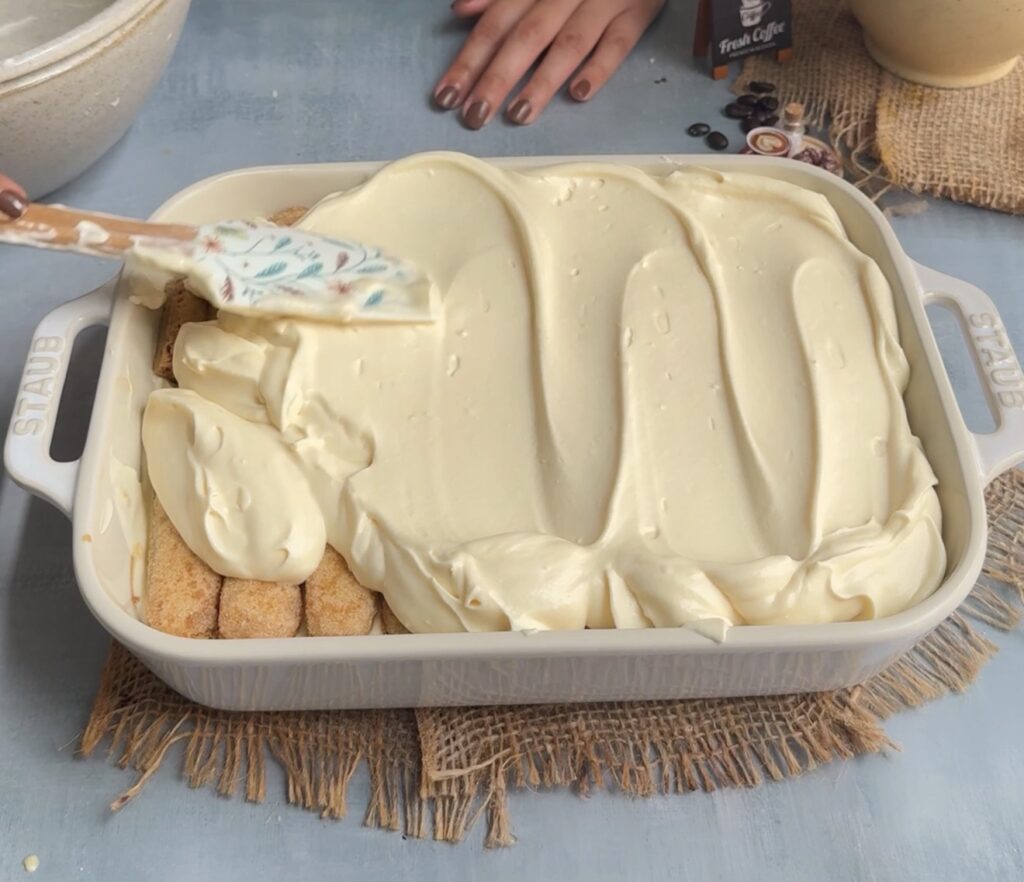 Add another layer of dipped ladyfingers followed by the remaining cream. Smooth the top for a clean, professional finish.