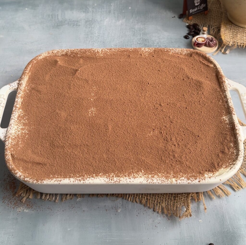 Cover and refrigerate for at least 6 hours, preferably overnight, to allow flavours to develop. Before serving, dust generously with cocoa powder, slice, and serve chilled.
