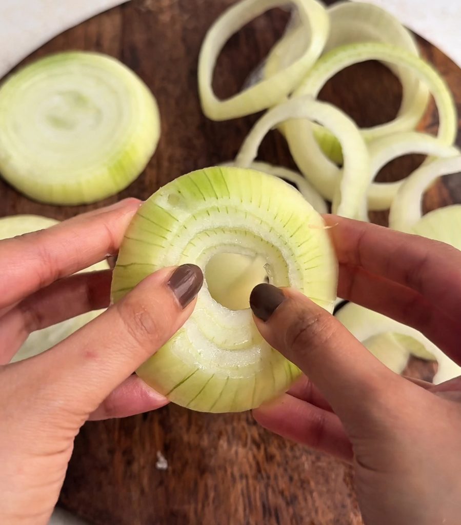 - Peel the onions and slice them into half-inch rings. Carefully separate the layers for even coating.