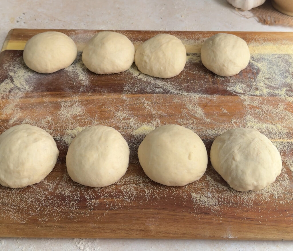 - Divide the dough into 10 equal portions (or up to 12 for thinner pizzas). Shape into tight balls, cover, and rest for 10 minutes while preheating the oven to 230°C (maximum temperature).
