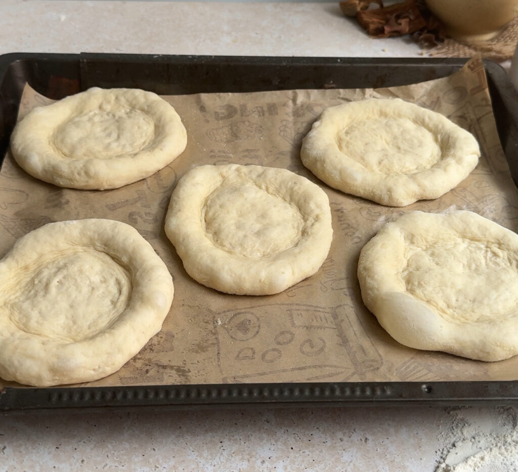 Then, gently stretch each dough ball into a 4-inch round using your hands. Avoid using a rolling pin for better texture.