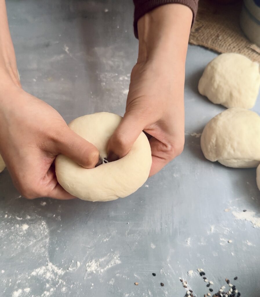 7. Shape each portion into a ball, then poke a hole in the centre and stretch it to form a bagel shape.