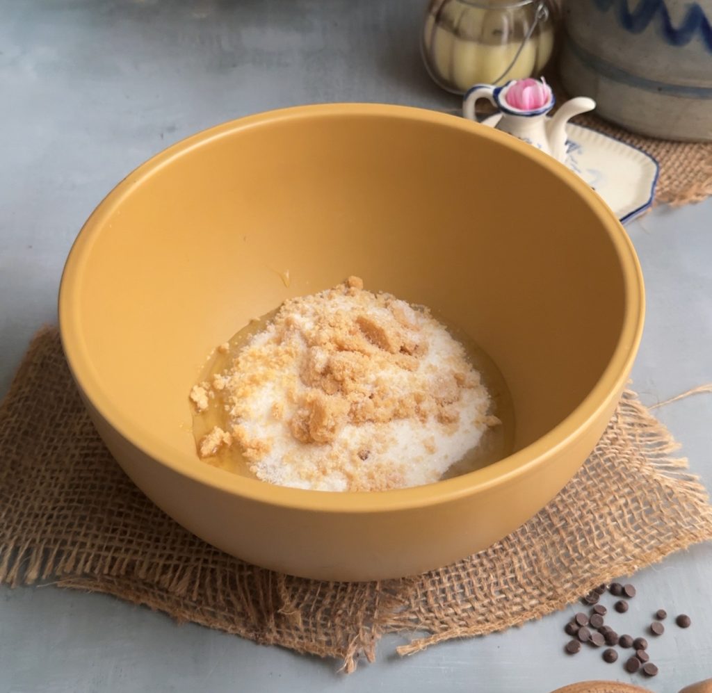 - In another bowl, add the egg, vanilla, white sugar, and brown sugar. Whisk with an electric mixer for about five minutes until the mixture becomes thick, pale, and glossy.