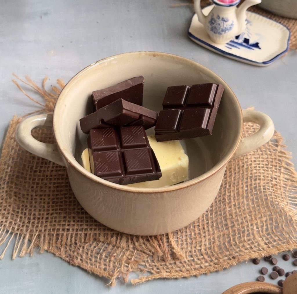 - In a microwave safe bowl, add the butter and dark chocolate. Heat in short intervals of about twenty seconds, mixing in between, until the mixture is completely melted and smooth. Set it aside to cool slightly.
