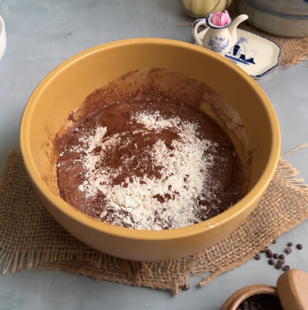 - Sift in the flour, cocoa powder, baking powder, salt, and cornflour. Fold the dry ingredients into the batter slowly until everything is just combined.