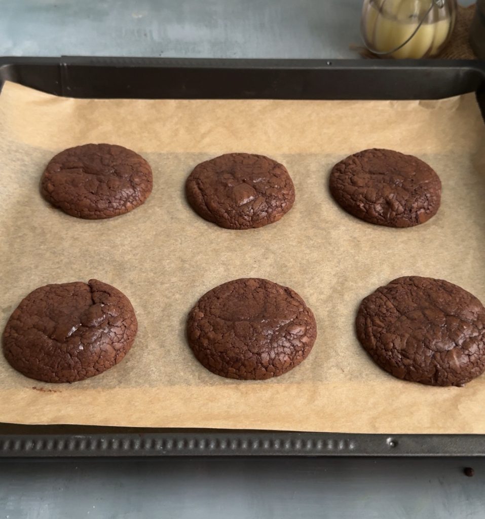 Finally, remove the tray from the oven and allow the cookies to rest on the baking tray for ten to fifteen minutes. The cookies continue to set as they cool, which helps keep the centre fudgy.