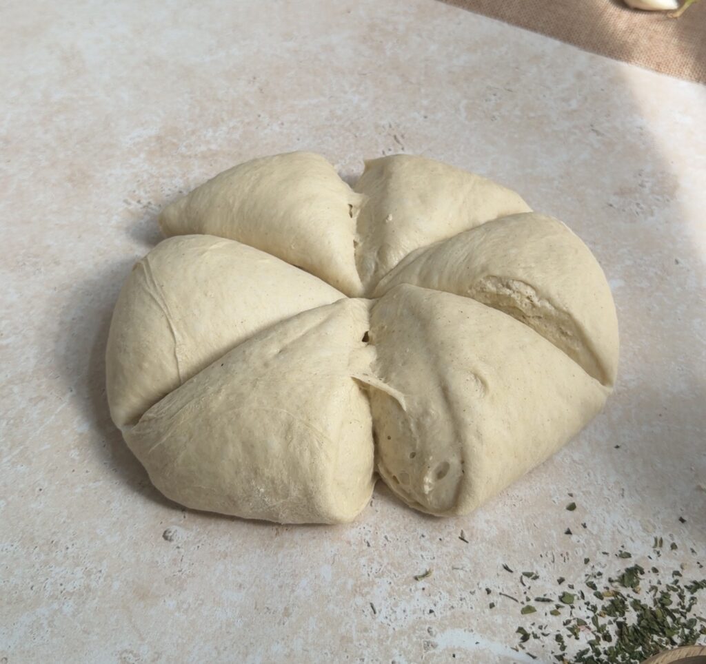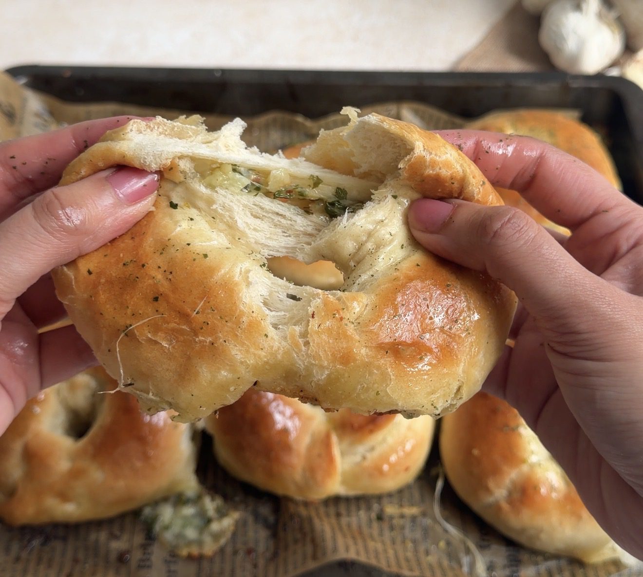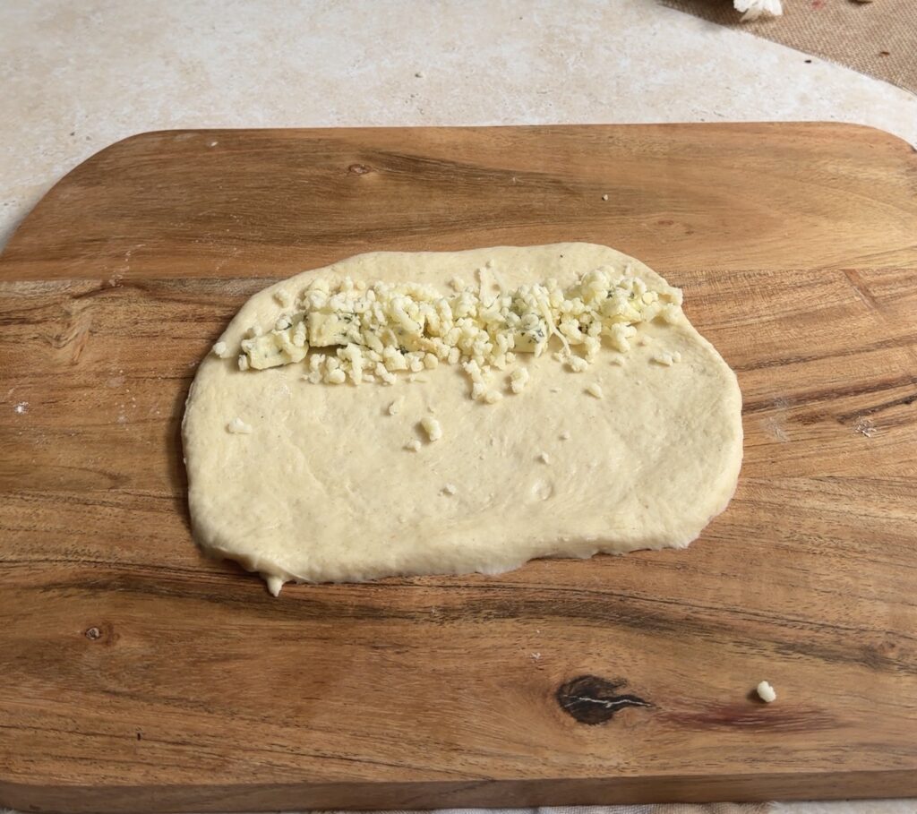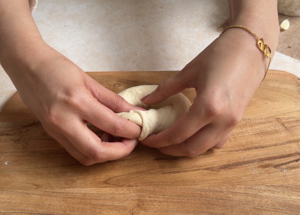 - Punch down the risen dough and divide into equal portions. Roll each portion into an oval, place garlic butter cubes and mozzarella in the centre, fold tightly, and shape into a bagel ring, sealing ends securely.