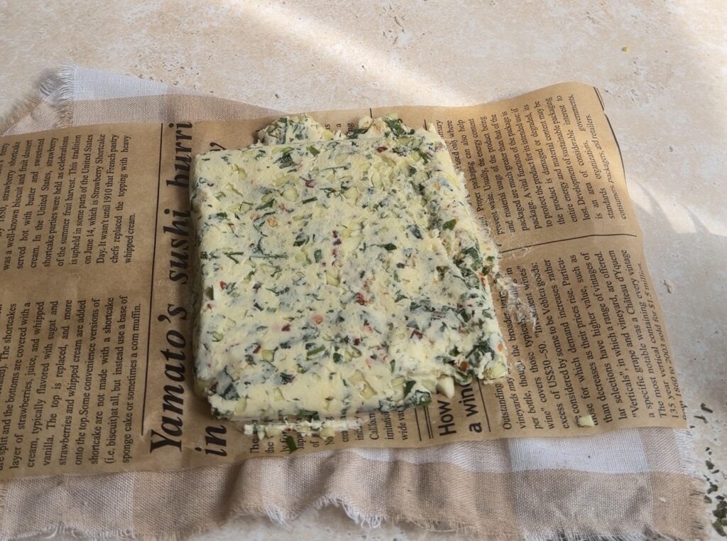 - Mix softened butter with chopped garlic, parsley, coriander, and chili flakes. Spread into a thin rectangle on parchment paper, refrigerate until firm, then cut into small cubes.