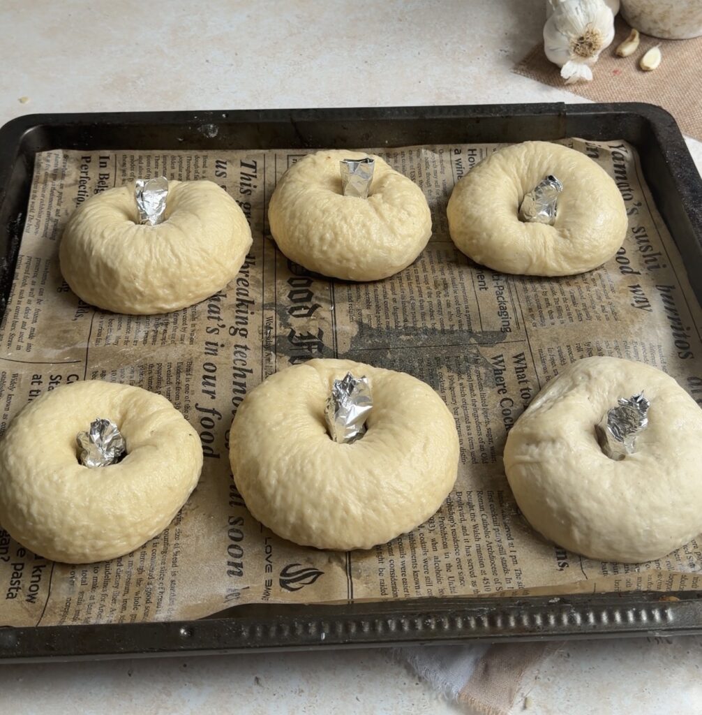 - Use foil to maintain shape – Placing a small strip of foil inside the bagel hole helps keep the ring shape during baking.