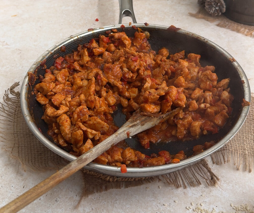 Next, heat butter in a pan and sauté the onions and peppers until softened. Add the marinated chicken and cook until it changes colour. Then stir in chopped chipotle, cream, red pepper paste, and an extra drizzle of honey if desired. Cook until the filling is thick and well coated, then remove from heat and let it cool slightly.