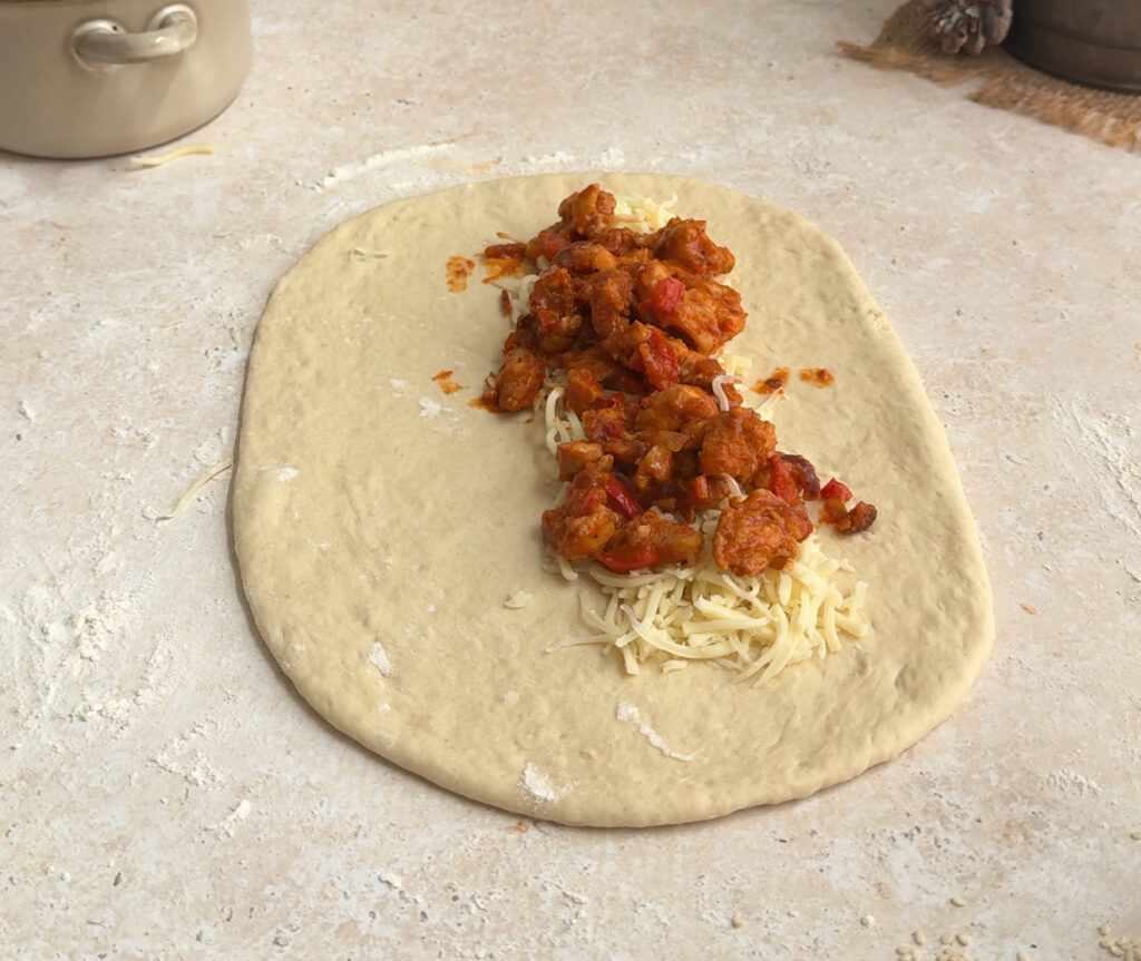 - Spread shredded mozzarella evenly over the dough, then add the cooled chicken filling. Fold the dough over the filling and seal the edges tightly.