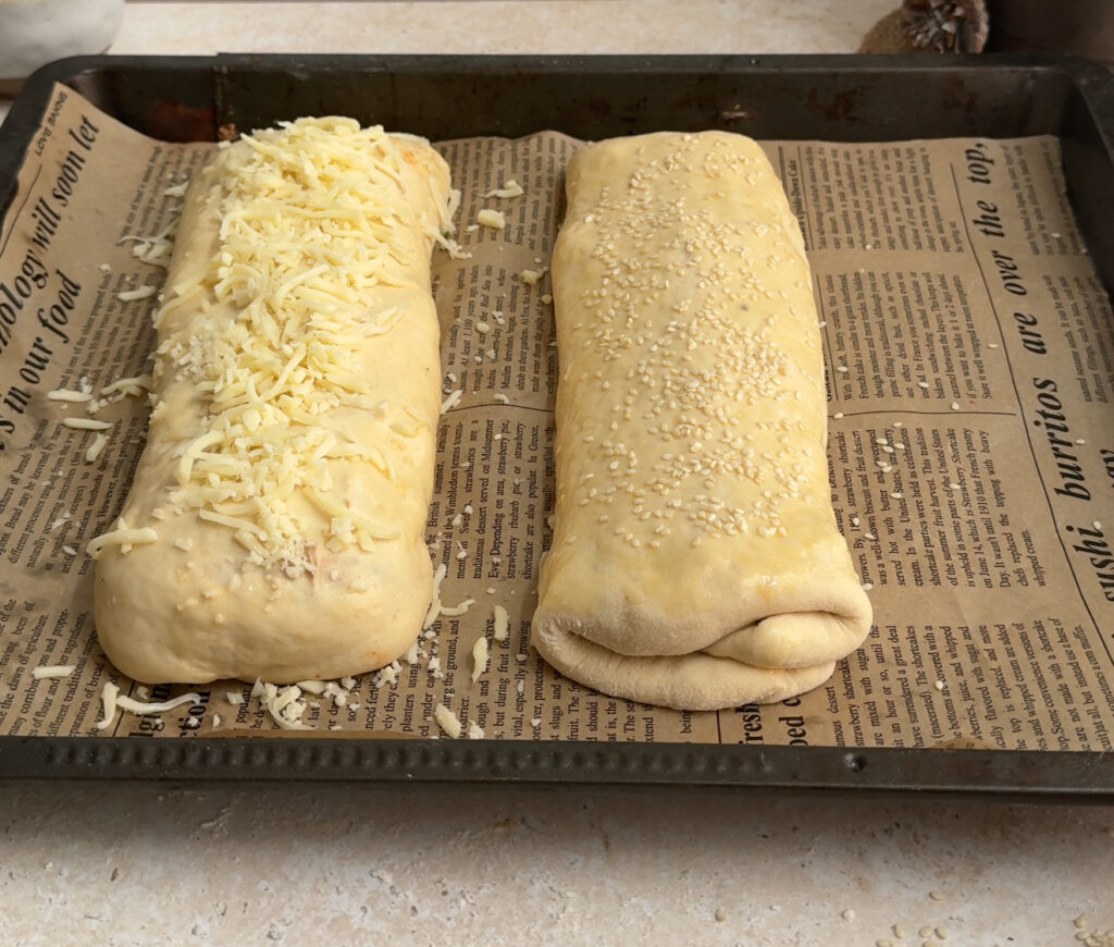 After shaping, place the stuffed bread on a lined baking tray. Brush the top with milk for a golden finish and sprinkle with sesame or nigella seeds if using.