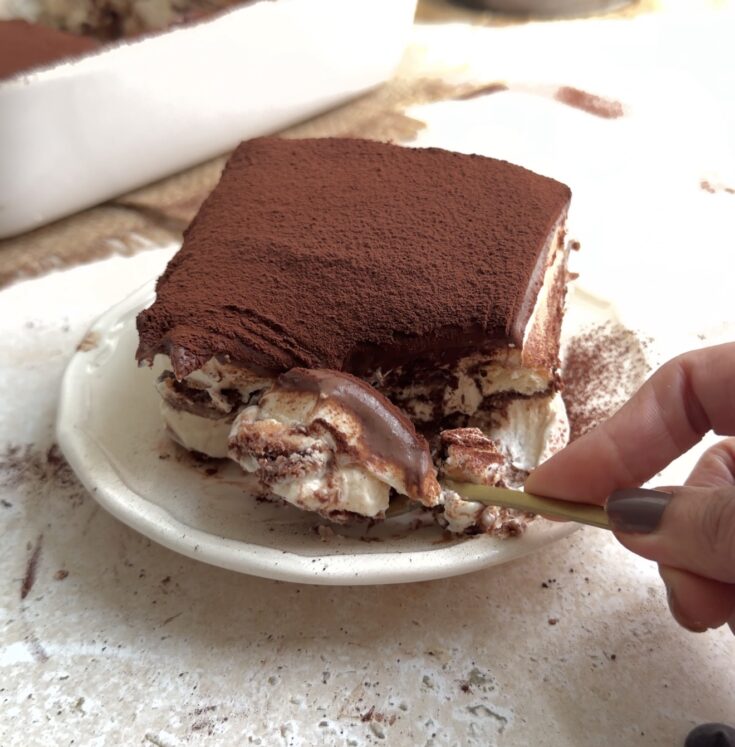 It will instantly become your go to dessert because this Hot Chocolate Tiramisu Recipe is creamy, eggless, and incredibly easy to make. Since it is a no bake dessert, it is effortless to prepare and ideal for make ahead gatherings because it tastes even better the next day. And if you prefer a stronger chocolate flavour, you can easily add extra ganache between the layers to make it more indulgent and chocolatey
