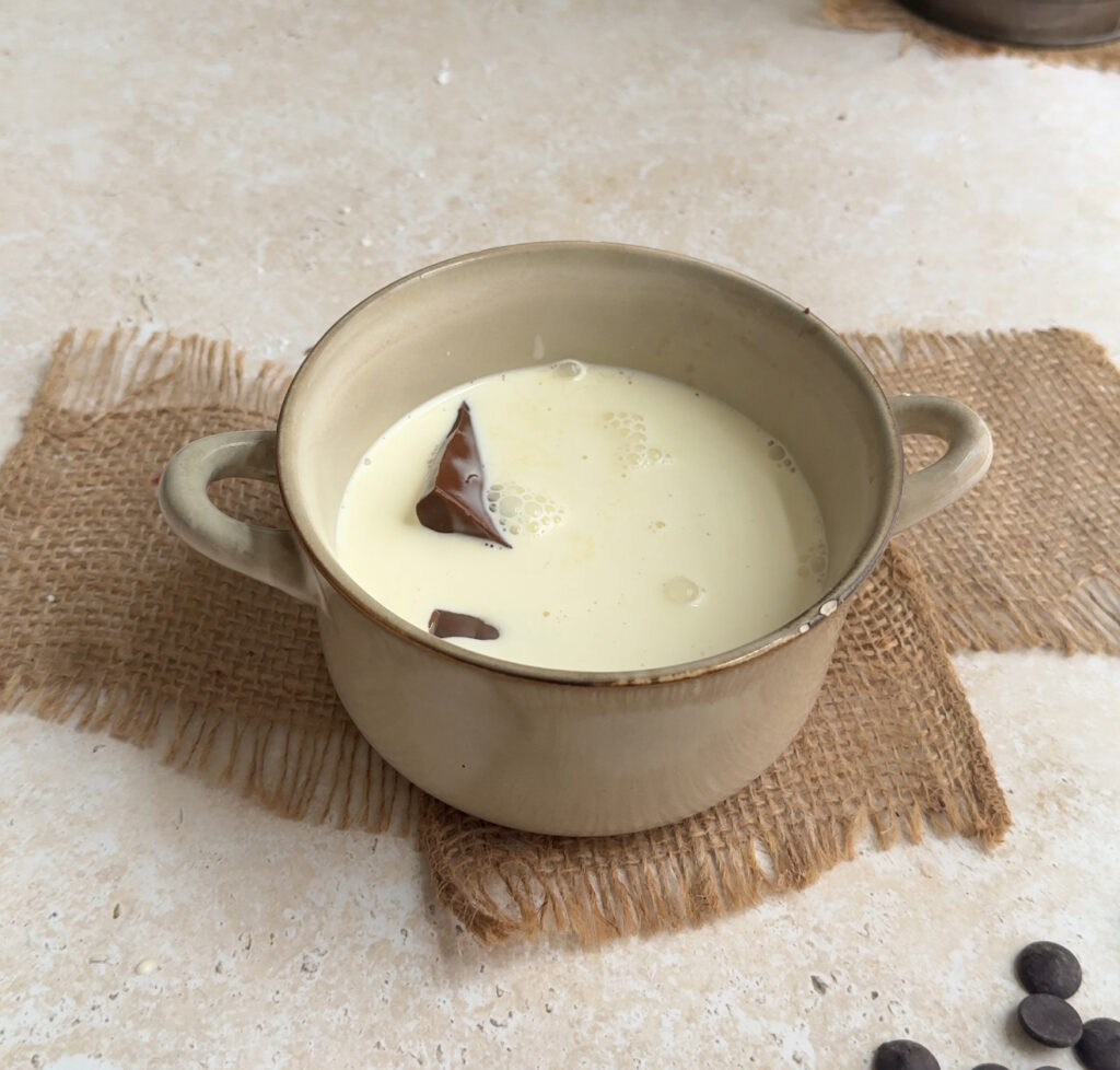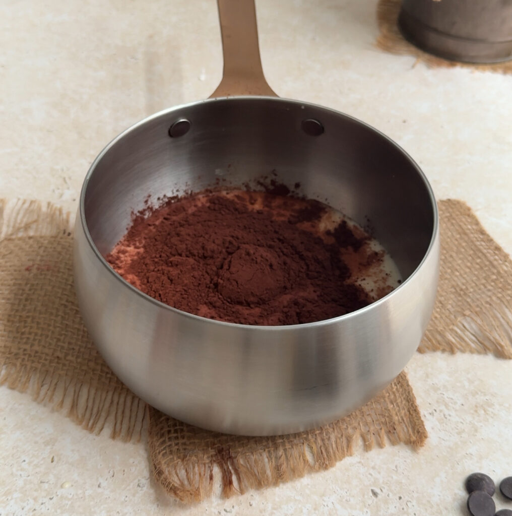 - For the hot chocolate soak, heat milk, cocoa powder, and instant coffee powder in a saucepan. Whisk until fully dissolved and smooth. Let it cool to warm.