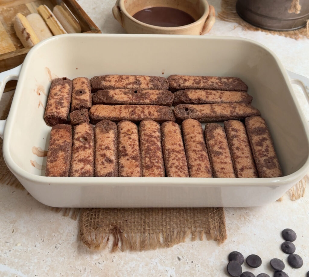 - Dip each ladyfinger briefly into the warm chocolate soak and arrange in a single layer in a 9x9 inch dish.