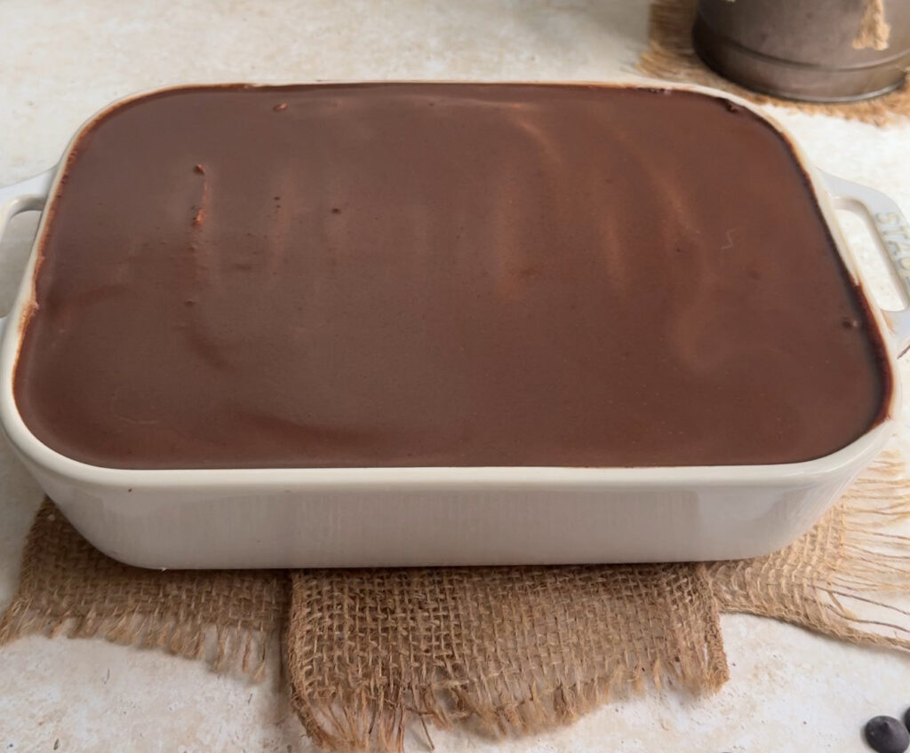 - Cover and refrigerate for at least 8 hours or overnight until fully set. Dust with cocoa powder before serving.